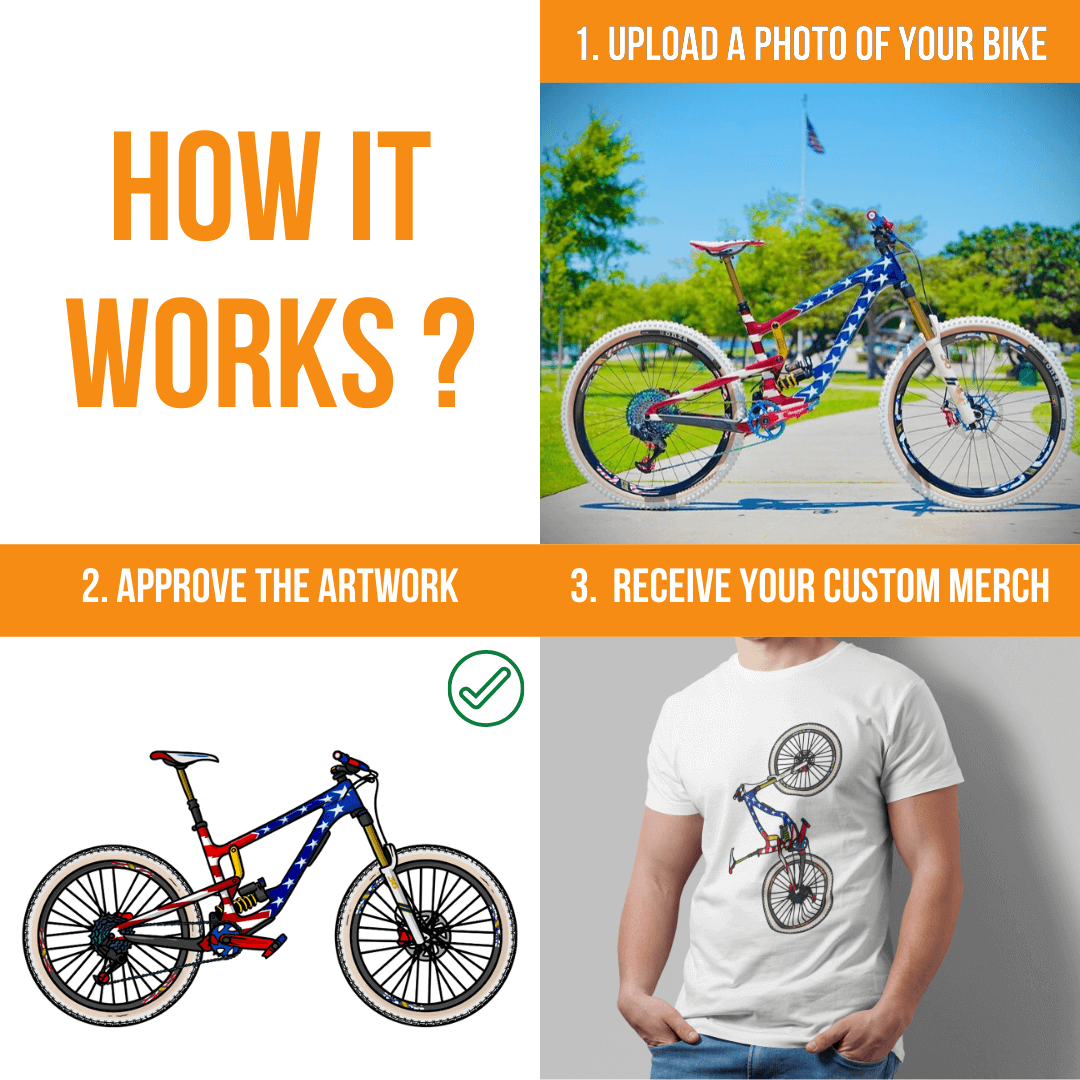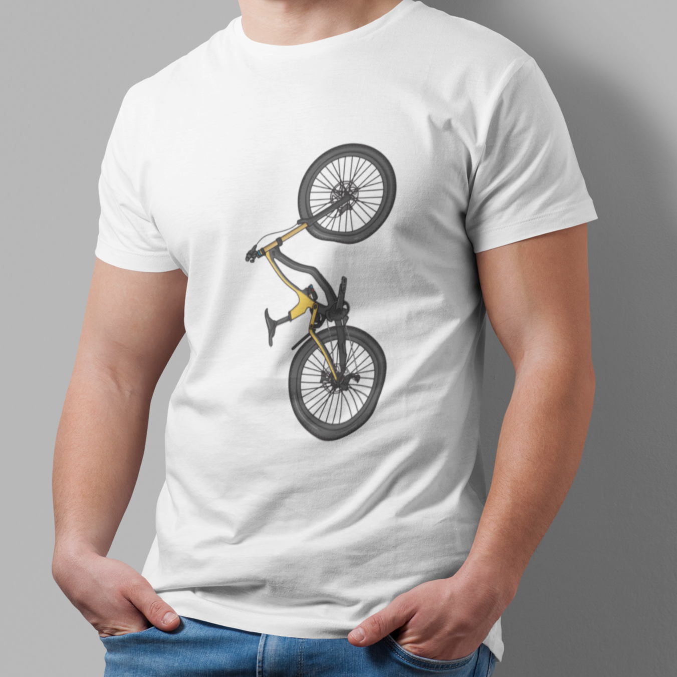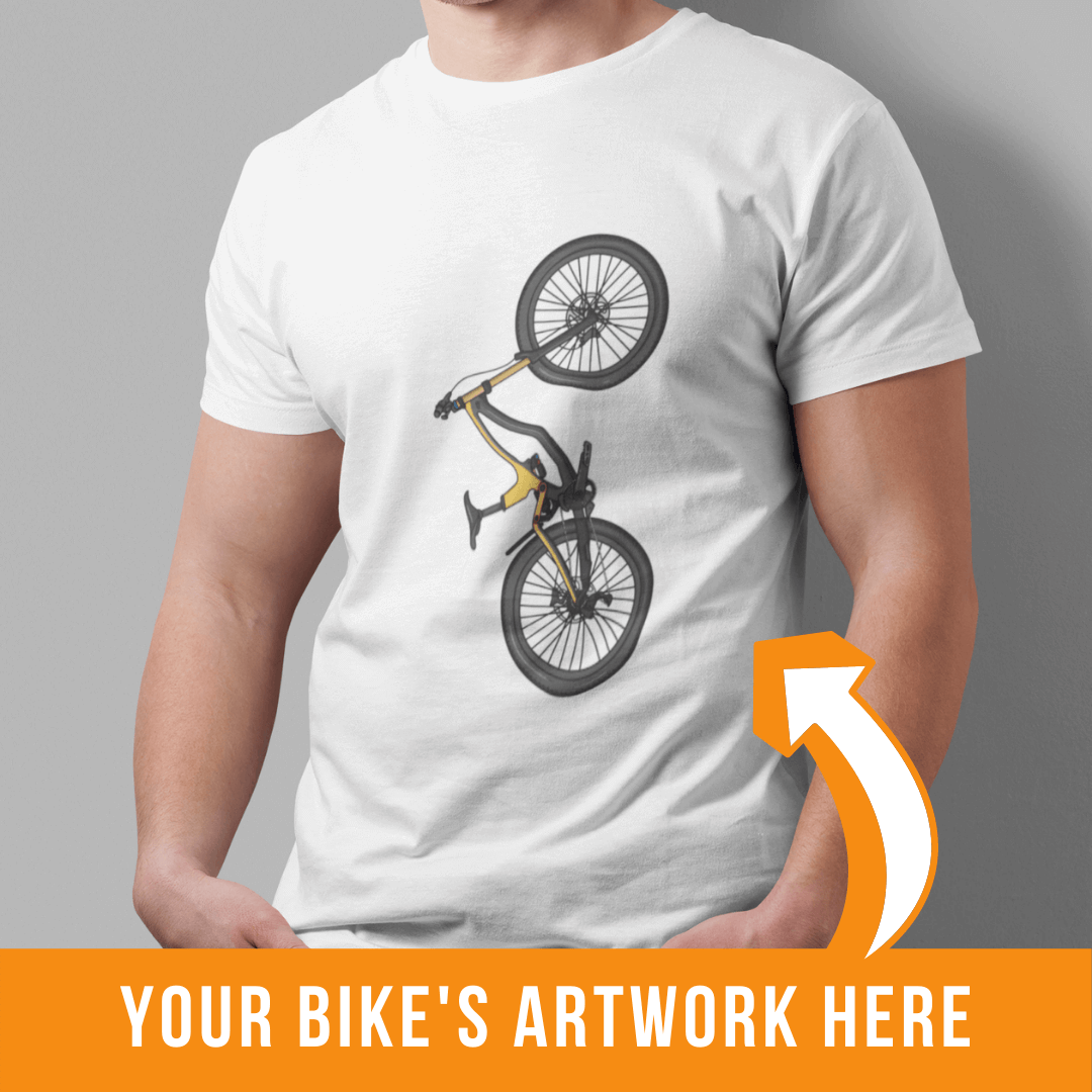 ONE-OF-A-KIND personalized T-Shirt designed by Stand Out Bikes. Why wear a boring standard t-shirt if you can get 100% custom made with your bike's artwork on it. Upload your bike's photo and Stand Out Bikes will take care of the rest. Perfect for those who are truly passionate about biking and love their bikes! Treat yourself with this unique tee or get it as a gift for your cycling or mountain biking buddy or a partner with their bike.